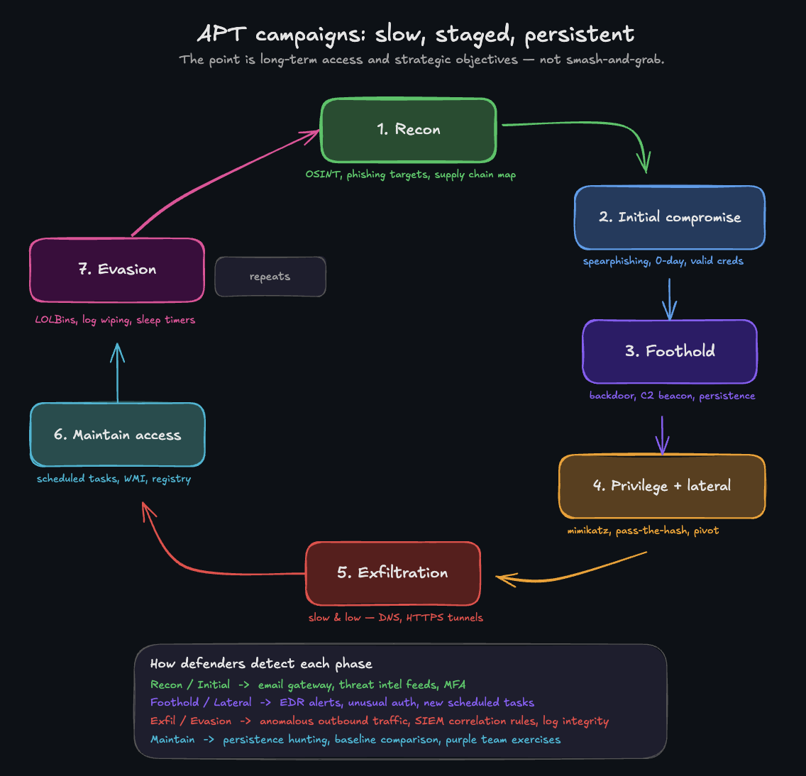 - Dwell time — APTs often remain undetected for months or years. Average dwell time is 200+ days