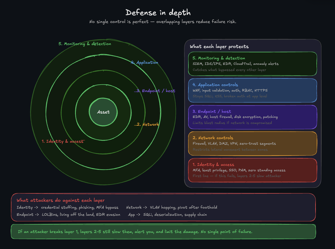 If an attacker tries to sneak in, multiple layers detect and block them. This is called defense in depth—multiple overlapping safeguards so no single failure opens the door completely.