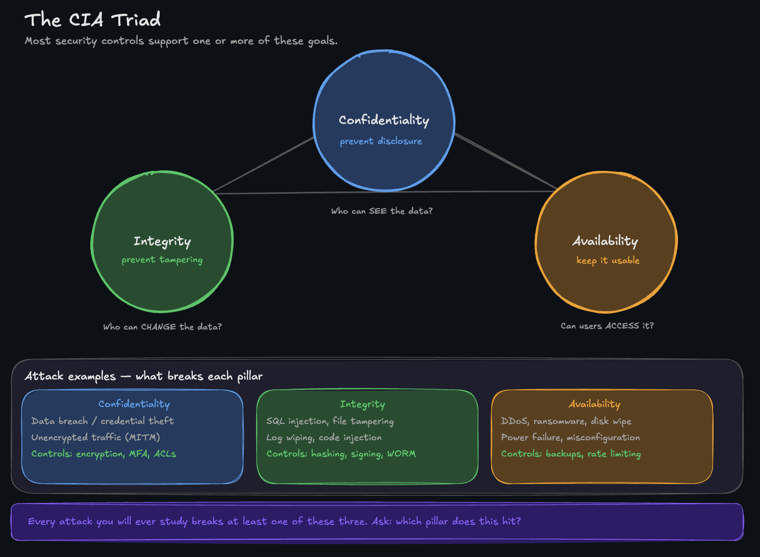 When you test a system as a penetration tester, you're evaluating whether these principles are actually implemented. Can someone access data they shouldn't (confidentiality failure)? Can they modify records without detection (integrity failure)? Can they disrupt access (availability failure)? These are the questions driving your work.