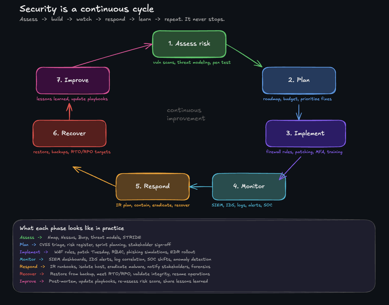 Security is never "done." Organizations review past incidents, test new threats, audit their controls, and update defenses based on lessons learned and emerging dangers.
