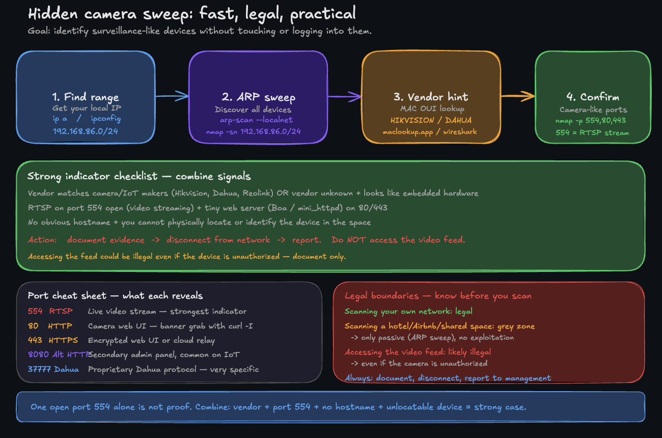 Only scan networks you have permission to use (your rental, your home). Scanning networks you're not authorized to access is illegal. This is for defensive purposes only.